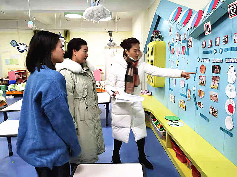 督導組在園區夏園長、胡主任的陪同下查看了幼兒園走廊、幼兒班級區域、以及班級的環境創設,并通過查閱資料、園區巡視、座談等多種方式,全面、細致的了解了我園活動設計、活動組織實施、師幼關系等有關情況。