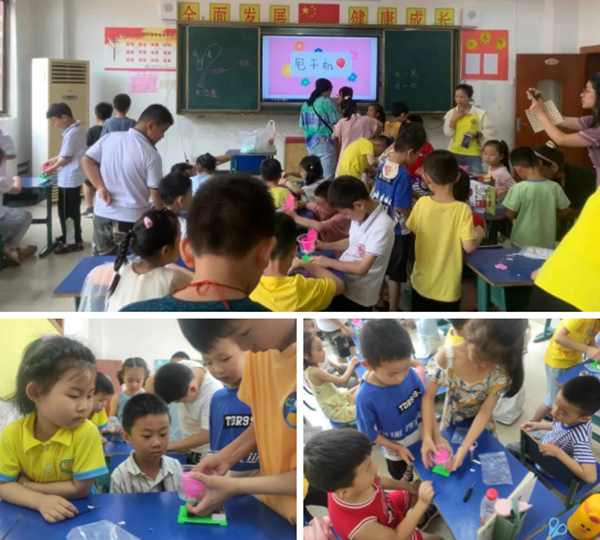 航模課上,孩子們體驗(yàn)了自制“甩干機(jī)”一課。好奇的孩子們瞪大了眼睛,緊盯著哥哥姐姐們給他們講解:先把所有零件按順序拼接好,再把電線小心地纏在電流的接觸點(diǎn)上,然后按正負(fù)極安裝好電池……最后,小小甩干機(jī)就做好了。他們把浸過(guò)水的小布頭放進(jìn)甩干機(jī)里,小心翼翼地啟動(dòng)按鍵,甩干機(jī)“呼呼”地轉(zhuǎn)動(dòng)起來(lái),不一會(huì)兒小布頭就甩干了!孩子們開(kāi)心地拍起手來(lái),高喊著:“航模課真是太有趣了!”