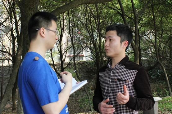 “傻子”班主任祝老師(右)接受江南都市報記者采訪