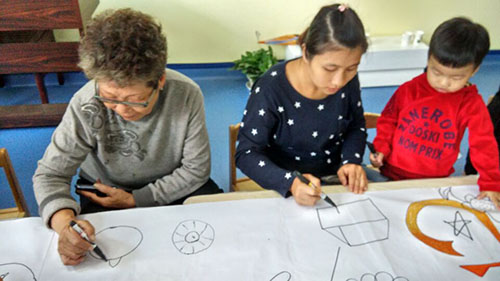 小朋友和老師家長們共同在畫紙上揮動手中的畫筆。看,小朋友們個個認真、專心畫畫的模樣,多可愛啊!