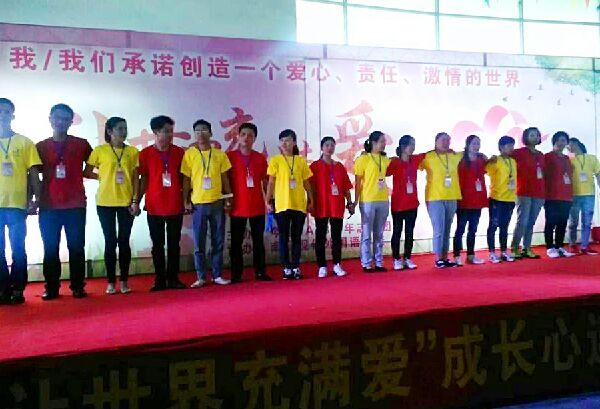 早在活動正式舉辦前,成長心連心公益團隊就與我校多次協(xié)商,希望布置出一個溫馨美麗、充滿愛意的活動環(huán)境。18日,熱心的義工們忙里忙外了整整一天,精心打造出了愛的家園,將夢想變成現實。校門口搭建了紅色的彩虹門,會場外有簽到墻、活動牌,不時有彩色氣球點綴其中。會場內除了搭建巨型舞臺外,還在舞臺四周共放置了許多大展板,上面分別寫著“表達愛、奉獻愛、傳遞愛”、“愛要說出來才是愛”、“我、我們承諾創(chuàng)造一個和平、共贏的世界”、“讓世界充滿愛”等大標語。這些滾燙的話語讓每一個進入會場的人都熱血沸騰、激情滿懷。