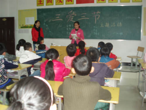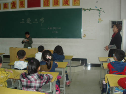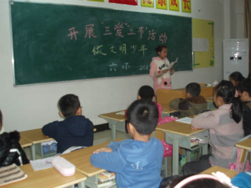 各班以班級為單位都開展了“三愛 三節”主題班會活動?;顒有问蕉鄻樱械囊灾R競答方式普及生活中的三愛三節知識,有的用多媒體播放愛學習、愛勞動、愛祖國的典型事例;有的以演講形式聯系身邊節水、節電、節糧的故事進行講解,闡述自己的收獲;有的制作手抄報反映自己對“三愛三節”的理解。