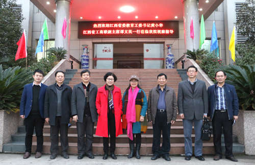 2016年1月4日下午,江西省委教育工作委員會書記黃小華、江西省工商聯副主席譚文英一行人蒞臨工商學院視察工作。學院董事長胡樂平、副董事長劉雁華、學院黨委書記劉富林等陪同視察。