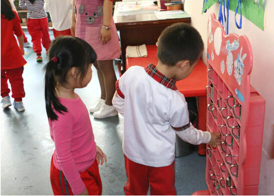 戶外活動結束后,各班幼兒在領隊老師的帶領下有序進入教室。隨后,家長跟隨園長老師們全程觀摩幼兒入廁、洗手、喝水、吃水果的常規活動。各班有序組織幼兒分組入廁、洗手、喝水、吃蘋果,主班老師在活動室和盥洗室門口隨時提醒幼兒有序排隊,并觀察其接水量等,整個活動環節沒有你擠我、我碰你的現象,保證了孩子的安全,每個環節都在教師的組織下井然有序進行。
