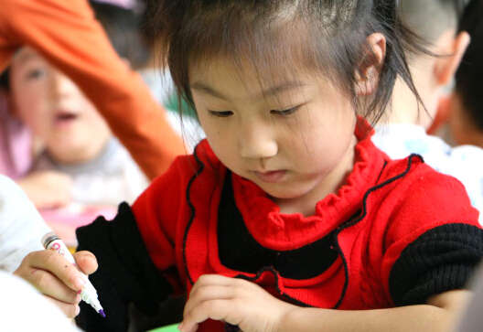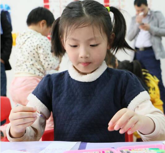 課堂上,家長和孩子們拿起畫筆,跟隨老師一起作畫,在歡樂的笑聲中共同完成了一節創意美術課程。各班教室桌上擺著紙和筆,孩子們可以根據自己的興趣自由選擇,老師會在一旁進行指導。有的小朋友腦洞大開,自顧自埋頭畫畫,也有的不熟練,和身邊的媽媽一起畫。小朋友和家長十幾個人圍著坐,一起創作,也欣賞對方的作品,不時有歡笑聲傳來。