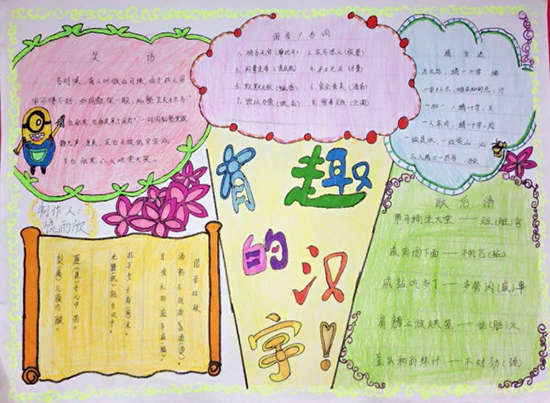 為了讓學生更好地了解漢字的起源,感受漢字的有趣和神奇,激發學生學習語文的興趣,近日,南昌現代外國語學校(象湖校區)五年級組結合語文教材中《綜合性學習:遨游漢字王國》,開展了“有趣的漢字”手抄報比賽。
