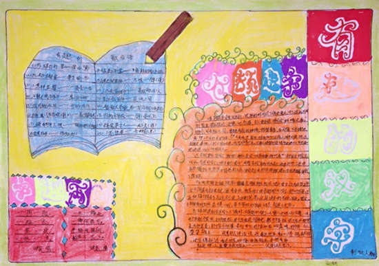 語文教材第五組《綜合性學習:遨游漢字王國》是引導學生進行綜合性學習,初步了解漢字的特點和發展歷史,加深學生對漢字和中華傳統文化的感情,提高正確運用漢字的自覺性。同時培養學生策劃和開展活動、查找和運用資料的能力。比賽前語文老師組織學生學習了有關課文,讓學生收集“有趣的漢字”各方面的知識,并通過自己靈巧的雙手,精心設計版面,創作出了一幅幅色彩艷麗、構思獨特、內容豐富的手抄報。本次手抄報內容涉及有趣的字謎、倉頡造字、一點值千金、諧音歇后語、諧音笑話、字的來歷等方面的知識,收到了很好的教育效果。