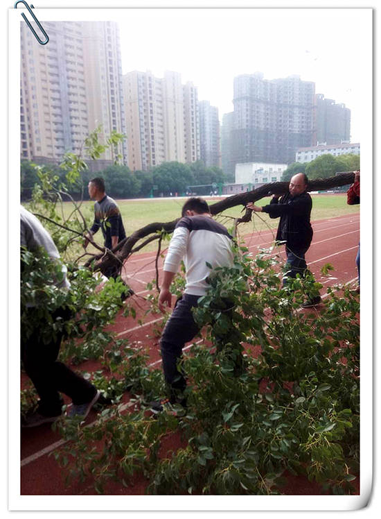 楊端煌校長(zhǎng)接到匯報(bào)后,立即帶領(lǐng)學(xué)校總務(wù)江主任、政教張主任、保衛(wèi)熊科長(zhǎng)、校醫(yī)、保安等人趕到現(xiàn)場(chǎng)。做完初步的分工后,不怕臟不怕累,親自動(dòng)手據(jù)樹(shù)、抬樹(shù)。經(jīng)過(guò)一個(gè)下午熱火朝天的修剪與清理,徹底消除了安全隱患,給師生們一個(gè)安全整齊的校園環(huán)境。同時(shí),運(yùn)動(dòng)場(chǎng)也變得更加寬敞明亮了。