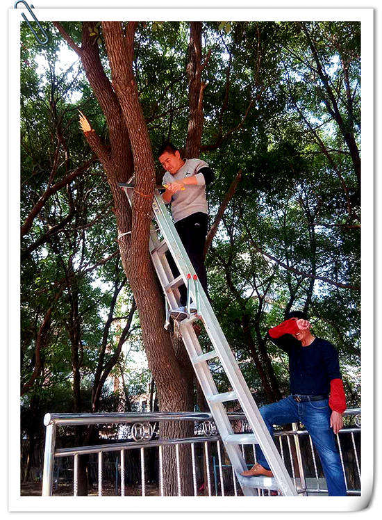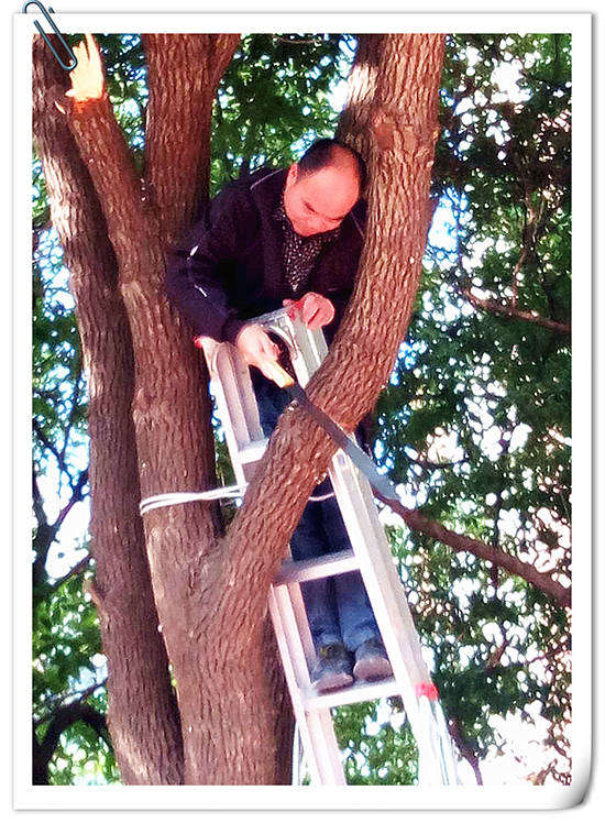 張主任站在梯子上鋸樹(shù)