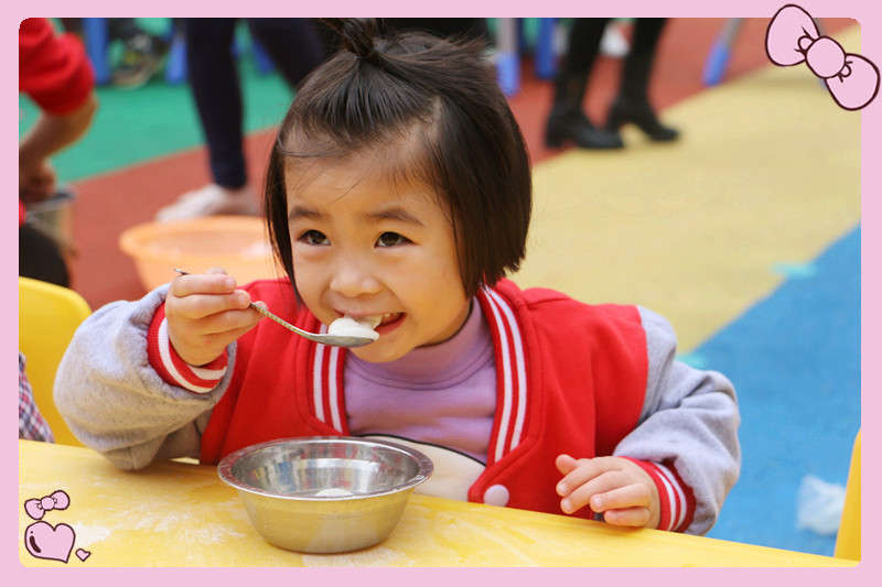 最后一個活動是家長和孩子一起包湯圓,大手包小手,小手包著圓圓的湯圓,每個人的臉上都洋溢著幸福的笑容。運動了一上午后,吃著自己包的湯圓,也是格外的甜,不知不覺比平時多吃了一些呢。