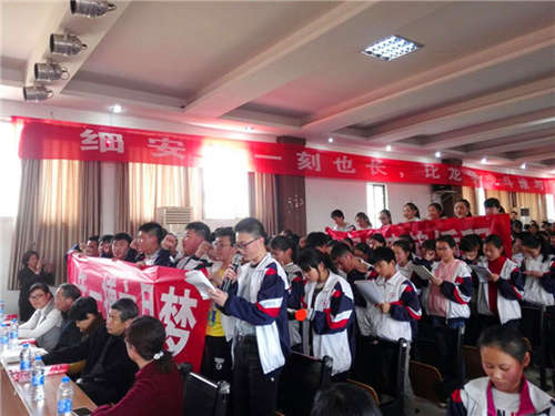 隨后,初三教師代表程興國老師作了一場熱情洋溢的沖刺動員講話,“為了大家能夠更加出類拔萃;為了大家能夠成為祖國的棟梁之才。我們傾其所有,助你們揚帆遠航,你們舉胸中豪情,與雷霆碰杯,傾熱血滿腔,同日月爭光。”那一句句鏗鏘有力、震撼人心的聲音賦予現場每個人奮進的信心與勇氣。話音剛落,初三全體教師個個斗志昂揚,在主席臺大聲宣誓,我們一定做你們的堅強后盾,為你們領航。請同學們以百倍的信心,銳不可當的氣勢來面對著一百天。接著學生代表萬新晨同學代表全體畢業生承諾:我們將以飽滿的情緒、昂揚的斗志,調動起全部的智慧,凝聚起全部的熱情,全身心地備戰中考。以優異的成績,給母校一個奇跡,給老師一個驚喜,給家長一個安慰!李亞萱同學的母親發言更是讓我們感受到了社會對我們學校工作的支持與認可。