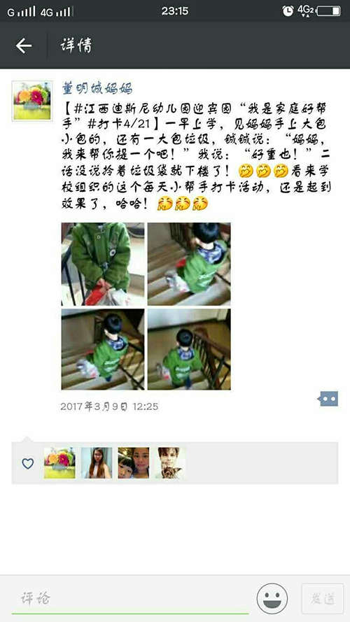 活動一推出,立即獲得了家長們的支持,家長們紛紛積極參與,將與孩子的互動記錄在朋友圈,并發在班級群內與家長們共同交流。此外,幼兒園還為家長們準備了獎狀,既感謝家長們對幼兒園工作的支持,也感謝家長們為孩子成長的付出。