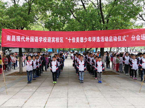 ? 為了響應南昌市教育局的號召,引導未成年人學習美德、踐行美德、弘揚美德、做一個有道德的人。鼓勵他們為長輩盡孝心,為他人獻愛心,為同學送關心。5月2日晨會,南昌現代外國語學校(迎賓校區)小學部全體師生參加了南昌市第三屆“十佳美德少年”評選活動的啟動儀式。啟動儀式在莊嚴的國歌聲中拉開了帷幕。