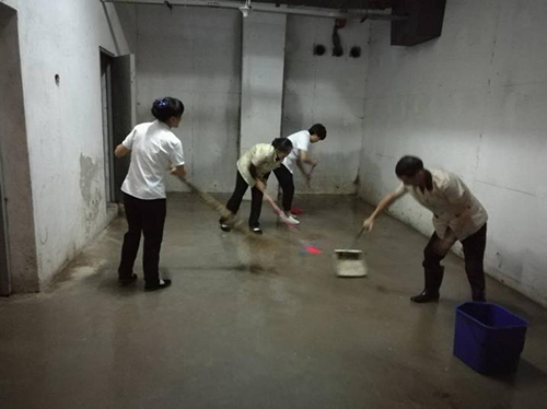 1、哪里需要到哪里,你看,保潔員、秩序員、客服員,還有品質(zhì)部經(jīng)理正在對(duì)積水進(jìn)行清掃。