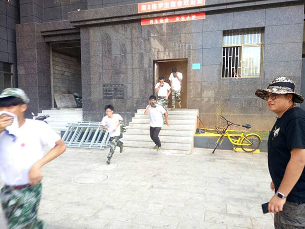 下午15:00教官帶領全體2017級新生在工商操場集合,首先由武裝部周圣華部長講述了消防疏散和應急救護演練的活動意義和要求,其次由學工處周艷萍處長作演練前動員報告和安全事項;教官和老師將學生帶到了南8棟,讓學生走進宿舍后,警報聲一遍遍被拉響,等于下達了“宿舍發生了火災,請同學們立即撤離”的命令。只見,學生們捂住口鼻,弓著腰,在教官和老師的指揮下,緊急有序地按指定的路線迅速撤離危險地帶。在各樓梯的轉角處安排了班主任、學生會干部接應,以防止發生學生因慌張擁擠而造成摔傷和踩踏事故。不一會兒,師生們便已到達了操場的指定位置。各班主任迅速維持紀律,清點參加演練人數并報告了現場總指揮武裝部周圣華部長,全體學生安全撤離完畢用時4分鐘,在活動中全體師生都保持了良好的秩序。