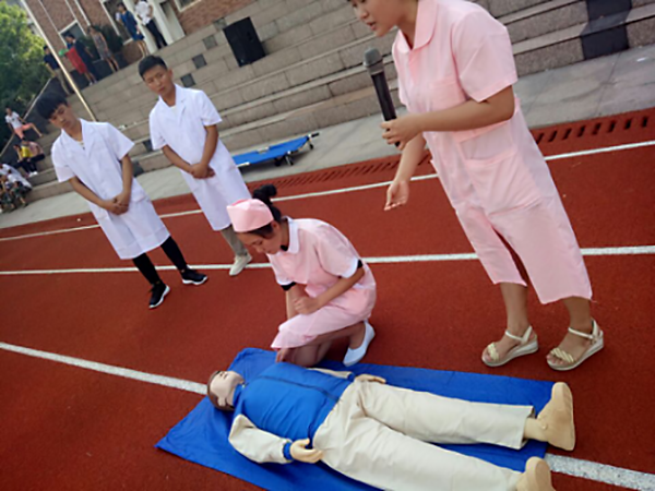 緊接著,護理系應急救護人員進行了實訓演練,在現場進行了心跳復蘇和傷口包扎等一系列動作,救護人員向觀看的全體新生進行了救護講解,增強了新生們安全應急救護的常識。
