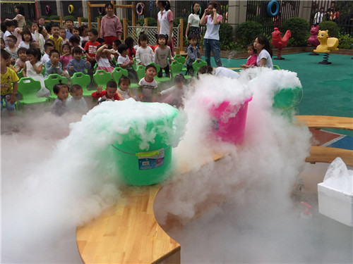 本次活動的主題是《干冰的奧秘》和《神奇的煙霧大炮》。活動開始通過一個小游戲來闡述二氧化碳的制作物——干冰的神奇效果。老師先往三個透明瓶子里裝滿了綠,籃,橙三種顏色的色素水,隨后加入了一些干冰,水馬上冒起了白煙。為了讓孩子們感受大氣壓力,老師分別用“大頭吹風(fēng)機”和“神奇的煙霧炮彈”等游戲,讓孩子感知氣壓以及氣壓與體積的關(guān)系。