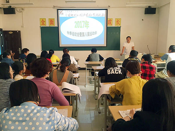 10月26日中午,南昌現代外國語(象湖校區)在多媒體教室召開第八屆秋季運動會裁判員培訓會,學校校長李金玉及兩個副校長出席會議,會議由中、小學兩位體育教研組長主持。