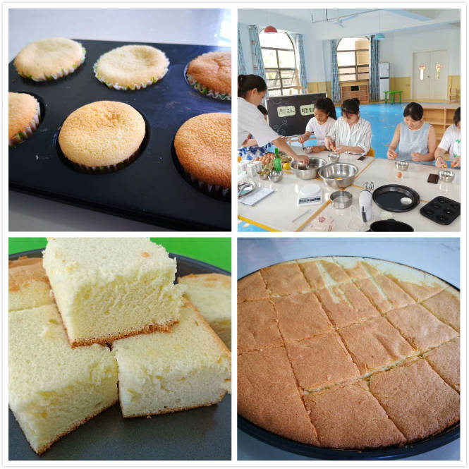 本次活動在園所的烘焙室里進行。首先由黃主任示范講解打雞蛋、攪拌、加面粉、烘烤的制作步驟方法,然后老師們開始親身體驗制作,有的老師對烘焙技能比較嫻熟,不一會兒就制作出散發著濃濃的香味的威風蛋糕,而有的老師是初次體驗,在調配材料的過程中,已經感受到了制作的辛勞,到了放面粉時更是專注力集中,因為一旦面粉放少了或者放多了,都會影響后期的烘烤。雖然如此,大家卻樂在其中、喜在心頭,在黃主任的指導下親手制作了香氣撲鼻、甜蜜誘人的威風蛋糕。