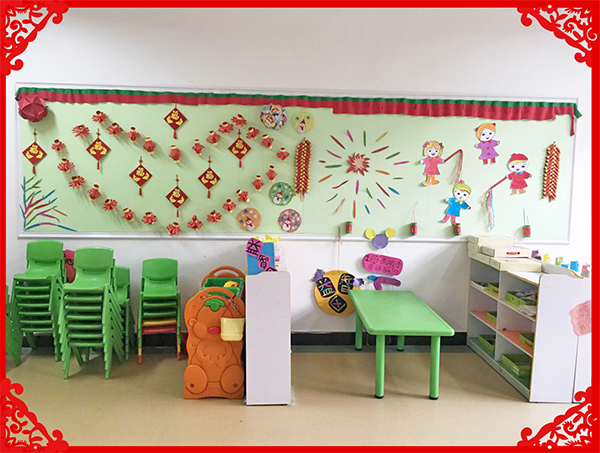 活動中,教師與幼兒進行了關于春節(jié)的互動話題,通過談話幼兒了解了春節(jié)的來歷及一些風俗習慣,并結合本班孩子的年齡發(fā)展特點,充分發(fā)揮想象力和創(chuàng)造力,師幼共同參與,廢舊利用創(chuàng)設了吉祥的紅燈籠、色彩絢麗的煙花、一串串紅紅的鞭炮、漂亮的剪紙“窗花”、“雪花”,使每個班級的主題墻都充滿了喜迎新年的節(jié)日氛圍,真是班班有特色,班班有新意。