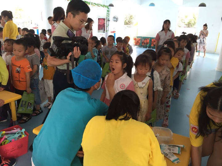 5月24日上午江西教育電視臺攜手江西衛生職業學院口腔門診部義診團隊來到我們迪斯尼象湖園,為中、大班的孩子們進行口腔健康檢查,義診現場,醫生們認真的給每個孩子檢查齲齒、錯合畸形、口腔衛生等檢查,一邊給孩子們檢查的同時,一邊提醒他們應該怎樣注意口腔健康,并針對發現的問題逐個指導孩子做好日常保健,養成良好的口腔衛生習慣,為孩子們建立口腔健康檔案。