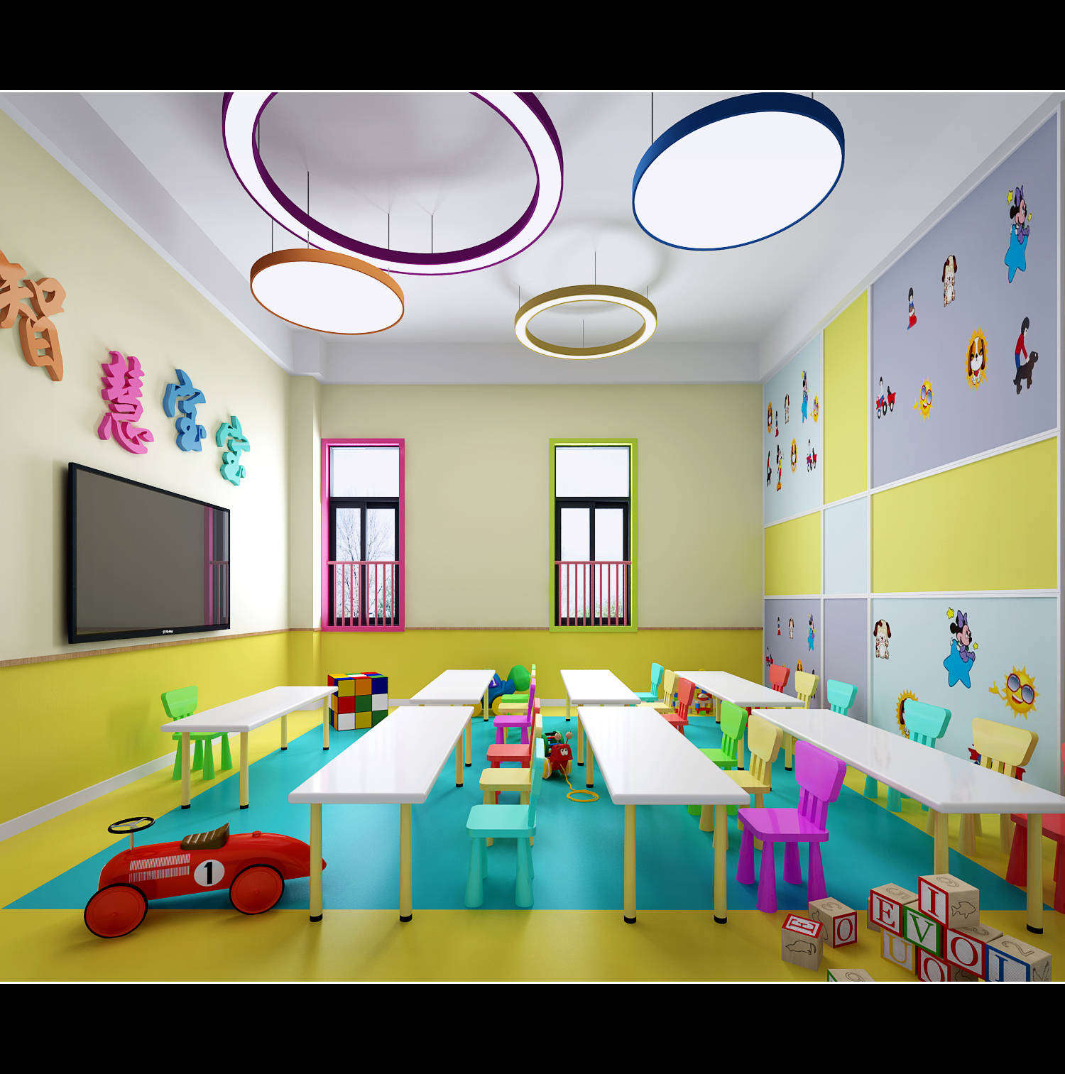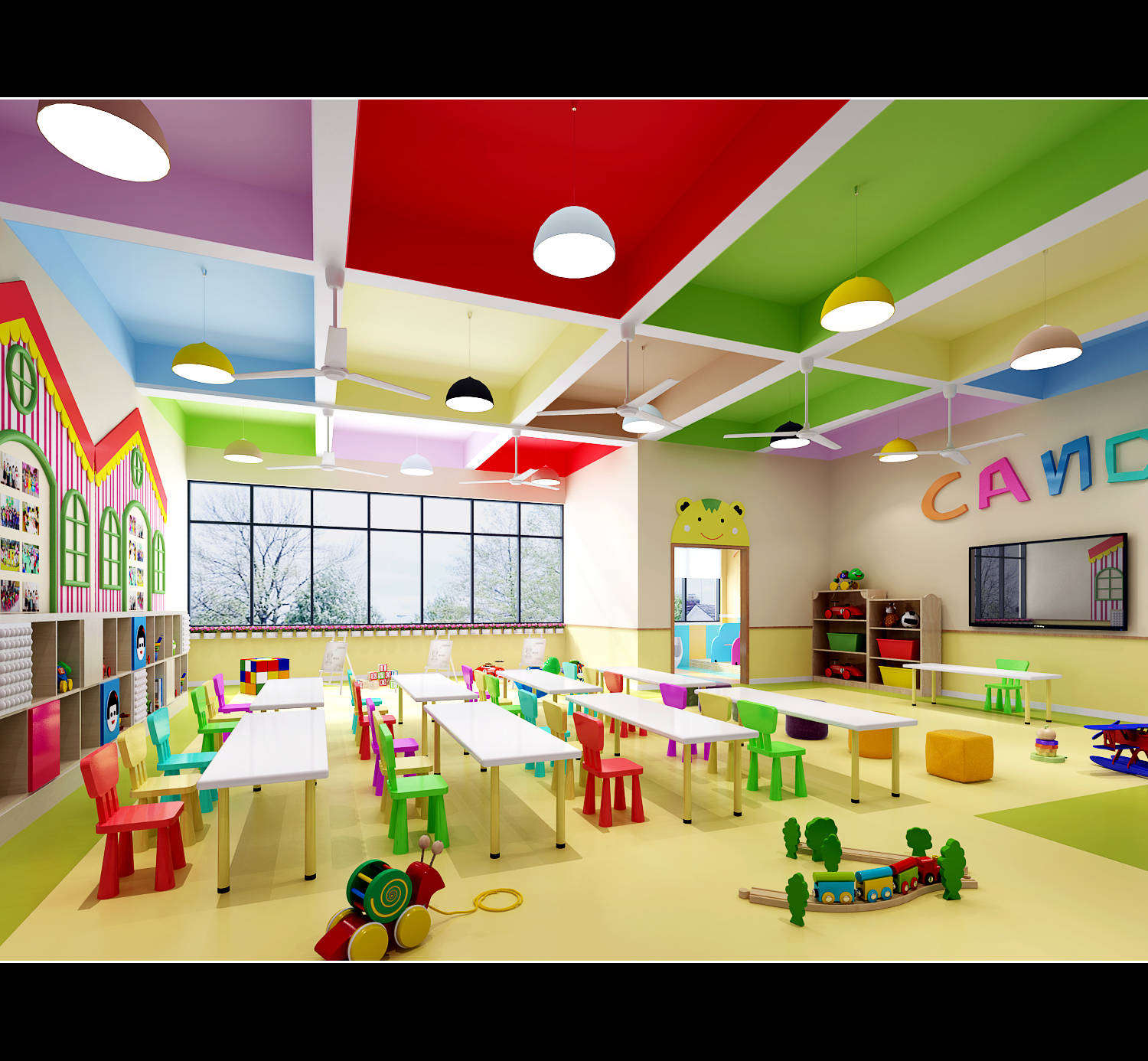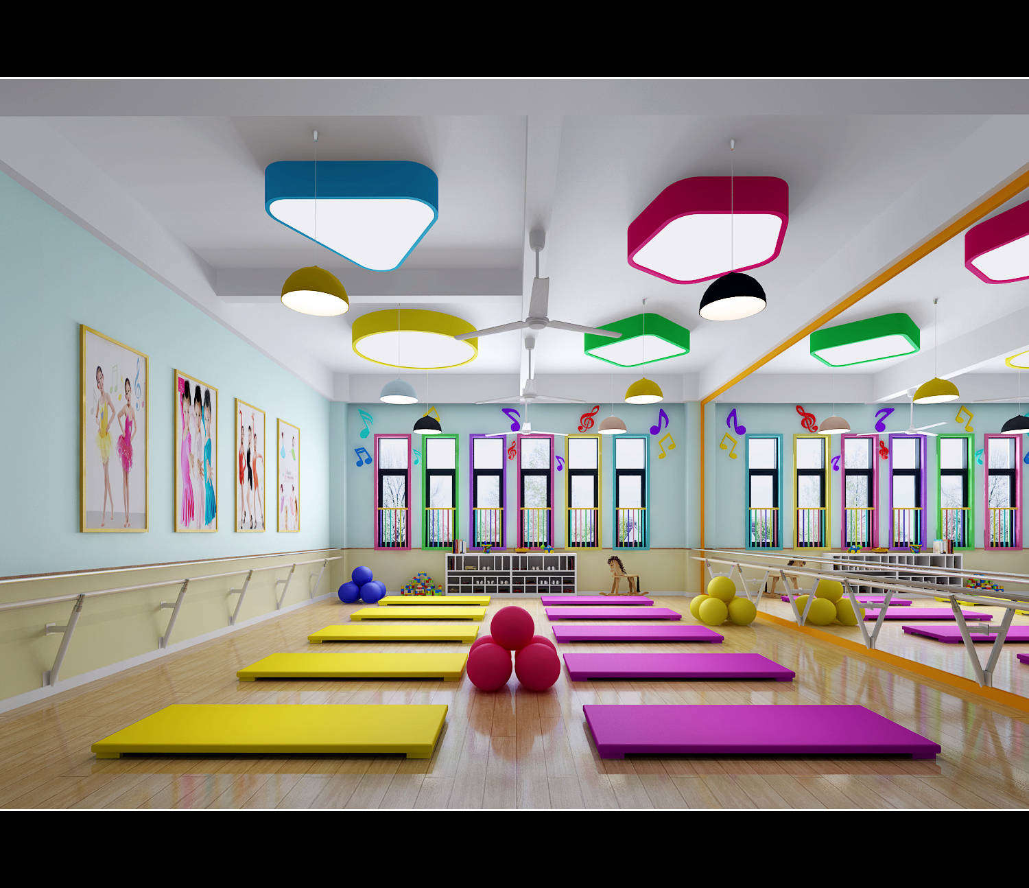 L形建筑與鐵藝欄桿圍合出大面積幼兒活動空間,大型幼兒游樂實施,成為小朋友游戲的天堂。多媒體一體機、鋼琴、空調、消毒柜、熱水器等現代化設備一應俱全;音樂室、美術室、手工室、舞蹈房、繪本館等專用活動室使孩子們流連忘返;樓層連環式的卡通文化設計,主題區角讓幼兒園真正成為孩子們生活、游戲、學習、創造、健康成長的快樂天地。