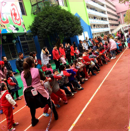 家長們除了參觀孩子們的早操,還觀摩了幼兒園的盥洗、餐前教育,以及一系列的教學活動。戶外進行的拔河比賽,孩子們的表現讓各位家長都稱贊不已:在拔河比賽中,孩子們個個鼓足干勁,齊心協力,堅持到底。