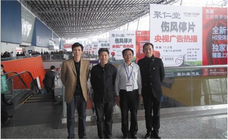 聚仁堂藥業領導團隊在第68屆全國藥交會現場傷風停片大幅廣告前合影