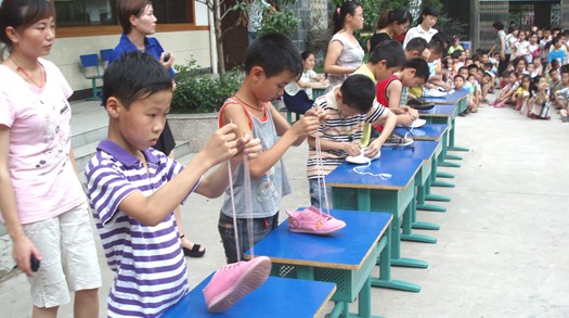 接下來是系鞋帶比賽,當(dāng)老師下令開始后,有的同學(xué)將鞋帶從鞋子的前眼開始穿帶,有的是一根鞋帶穿到底,引起了同學(xué)們的陣陣笑聲。原來每天穿鞋帶也有這么多的學(xué)問啊,有的參賽的同學(xué)囧得是滿臉通紅。