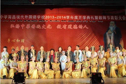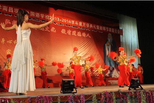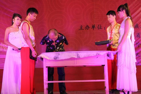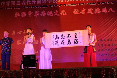 演出中,校長涂序健上臺接受了“心靈之聲”藝術團贈送的墨寶《志存高遠》,并代表全校師生對參加表演的殘疾演員表示衷心的感謝并致以崇高的敬意。